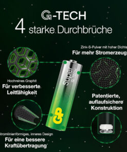 Μπαταρίες GP Super Alkaline AAA Micro με τεχνολογία G-TECH που προσφέρουν έως και 50% περισσότερη ισχύ, επιτρέποντας τη χρήση των συσκευών σας για μεγαλύτερο χρονικό διάστημα χωρίς διακοπές. Η τεχνολογία G-TECH διασφαλίζει μεγαλύτερη διάρκεια ζωής για τις συσκευές σας. Οι μπαταρίες παρέχουν περισσότερη ισχύ χρησιμοποιώντας γραφίτη υψηλής καθαρότητας. Επιπλέον, χρησιμοποιείται υψηλής ποιότητας Ζinc-S σκόνη για ταχεία απορρόφηση ενέργειας και σταθερή υψηλή απόδοση σε διάστημα μεγαλύτερης χρονικής διάρκειας. Η ειδική προστασία από διαρροές αποτρέπει τις διαρροές των μπαταριών, προστατεύοντας τις συσκευές σας.