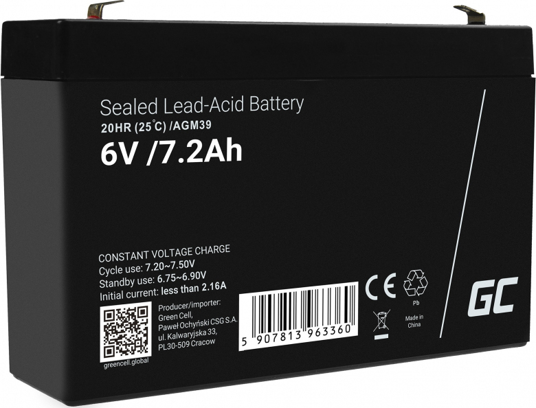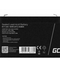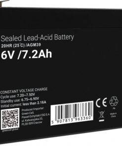 Μπαταρία AGM VRLA Green Cell AGM39 6V 7.2Ah, ιδανική για συστήματα συναγερμού, ταμειακές μηχανές και παιχνίδια. Χωρίς συντήρηση, προσφέρει αξιόπιστη απόδοση και μακροχρόνια διάρκεια ζωής.