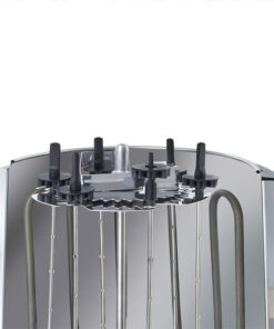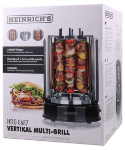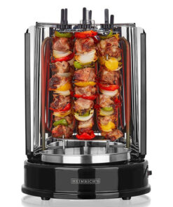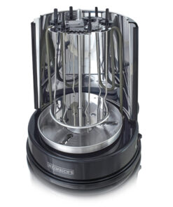 Κατάλληλο γκριλ για ψήσιμο γύρου, κεμπάπ, κοτόπουλου, σουβλάκια, με περίβλημα από υψηλής ποιότητας ανοξείδωτο ατσάλι και πολύ γρήγορο και εύκολο καθάρισμα χάρη στον αφαιρούμενο δίσκο συλλογής λίπους. Διαθέτει ανακλαστικό φύλλο θέρμανσης από ανοξείδωτο χάλυβα για βέλτιστη χρήση της ενέργειας, μεταλλικά θερμαντικά στοιχεία, για μεγαλύτερη διάρκεια ζωής και ομοιόμορφο μαγείρεμα και πάνελ περιστροφής 360°. Η ψησταριά διαθέτει διακόπτη ON / OFF με ενδεικτική λυχνία λειτουργίας, εύκολη και γρήγορη αποσυναρμολόγηση, όλα τα εξαρτήματα πλένονται στο πλυντήριο πιάτων. Συμπεριλαμβάνονται περιστρεφόμενη σούβλα ψησίματος και 6 περιστρεφόμενα σουβλάκια.
