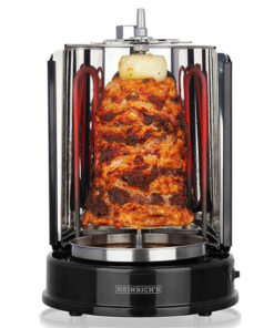 Κατάλληλο γκριλ για ψήσιμο γύρου, κεμπάπ, κοτόπουλου, σουβλάκια, με περίβλημα από υψηλής ποιότητας ανοξείδωτο ατσάλι και πολύ γρήγορο και εύκολο καθάρισμα χάρη στον αφαιρούμενο δίσκο συλλογής λίπους. Διαθέτει ανακλαστικό φύλλο θέρμανσης από ανοξείδωτο χάλυβα για βέλτιστη χρήση της ενέργειας, μεταλλικά θερμαντικά στοιχεία, για μεγαλύτερη διάρκεια ζωής και ομοιόμορφο μαγείρεμα και πάνελ περιστροφής 360°. Η ψησταριά διαθέτει διακόπτη ON / OFF με ενδεικτική λυχνία λειτουργίας, εύκολη και γρήγορη αποσυναρμολόγηση, όλα τα εξαρτήματα πλένονται στο πλυντήριο πιάτων. Συμπεριλαμβάνονται περιστρεφόμενη σούβλα ψησίματος και 6 περιστρεφόμενα σουβλάκια.