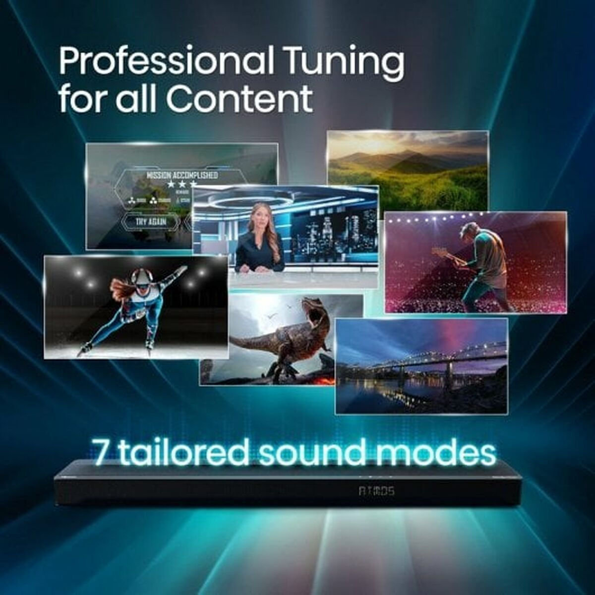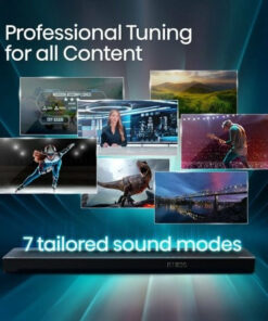 Η AI EQ λειτουργία προσαρμόζει αυτόματα τον ήχο ανάλογα με το περιεχόμενο, προσφέροντας 7 διαφορετικά ηχητικά προφίλ για τέλεια απόδοση σε ταινίες, μουσική, αθλητικά και gaming. Διαθέτει Bluetooth 5.3, HDMI IN & OUT (ARC), USB, Optical και AUX εισόδους, επιτρέποντας εύκολη σύνδεση με τηλεοράσεις, κονσόλες, laptops και άλλες συσκευές.