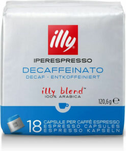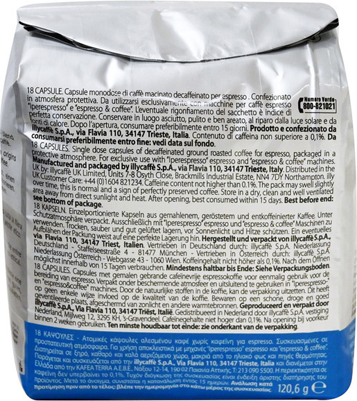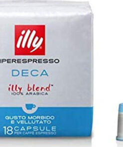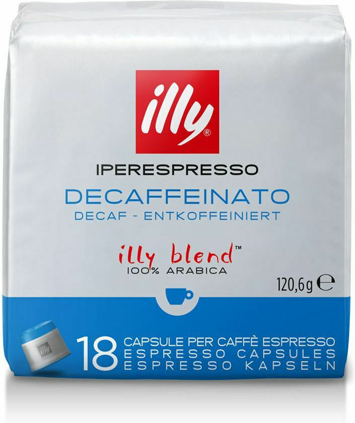 Κάψουλες Illy Iperespresso Decaf 21 τεμαχίων συσκευασμένες υπό πίεση. Decaffeinated (πράσινη ένδειξη): ίδια γεύση και άρωμα με τις κάψουλες medium roast, με πολύ χαμηλή περιεκτικότητα καφεΐνη (0,05%).