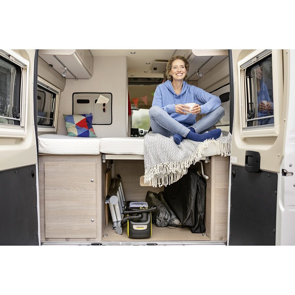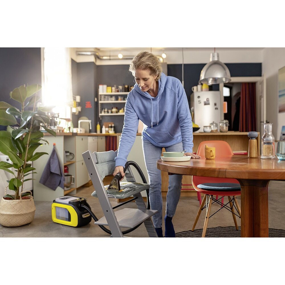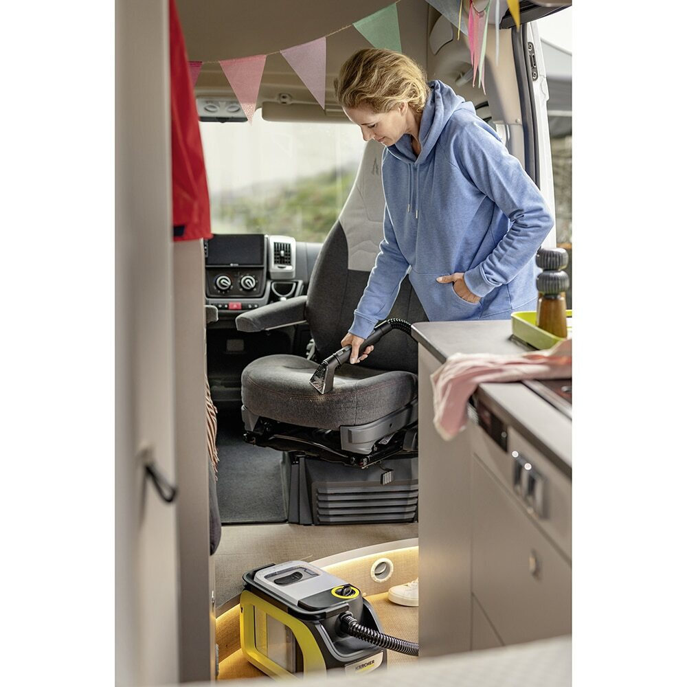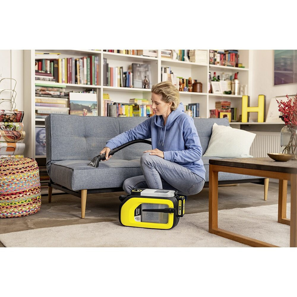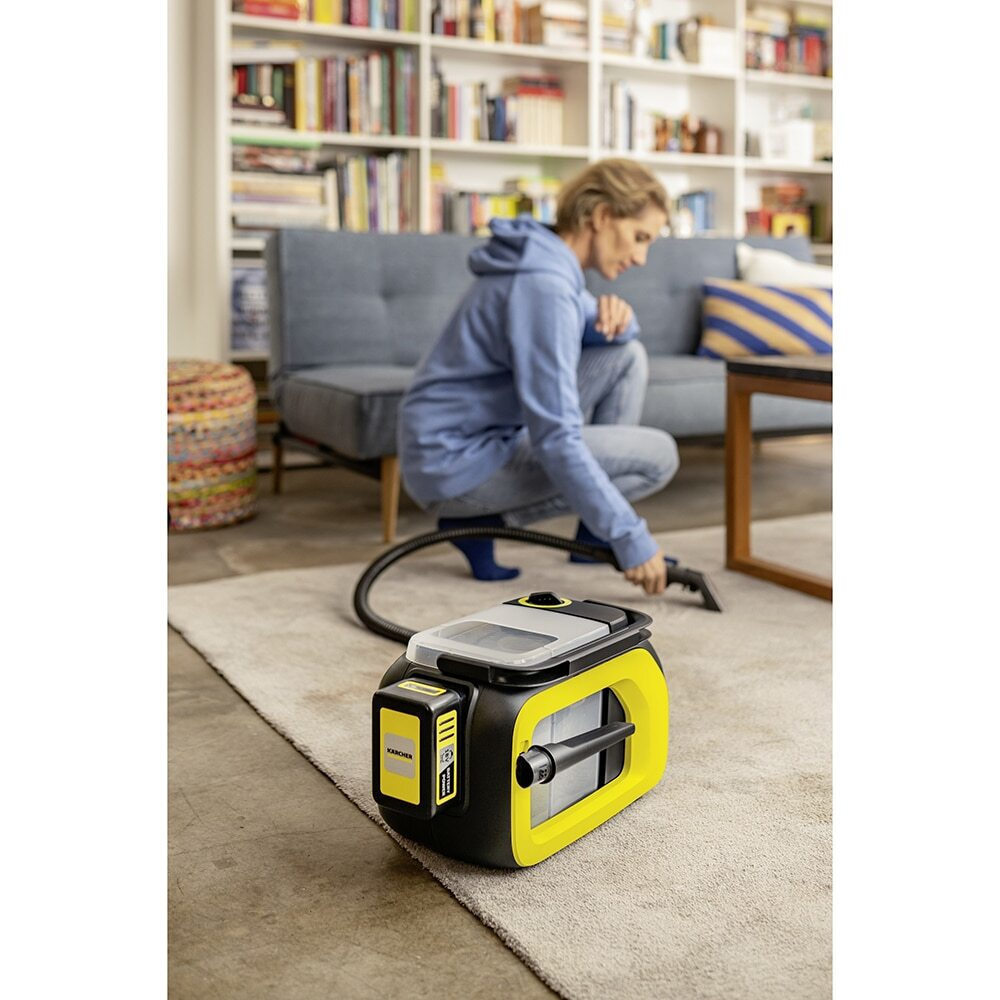 Βαθύς καθαρισμός ινών με μέγιστη ελευθερία κινήσεων: Η σκούπα SE 3-18 Compact καθαρίζει τις υφασμάτινες επιφάνειες σχολαστικά και χωρίς υπολείμματα. Χάρη στη συμπαγή σχεδίαση, η συσκευή δεν είναι μόνο εύχρηστη, αλλά μπορεί επίσης να χρησιμοποιηθεί όταν δεν υπάρχει πρίζα κοντά, λόγω της μπαταρίας 18 V Kärcher Battery Power (δεν περιλαμβάνεται στον βασικό εξοπλισμό). Αυτό επιτρέπει τον καθαρισμό του εσωτερικού του οχήματος, των χαλιών ή άλλων υφασμάτινων επιφανιών σε μόλις 12 έως 24 λεπτά. Έτσι αφαιρείς τους ρύπους από τα καθίσματα αυτοκινήτου, τα πατάκια και το πορτμπαγκάζ, καθώς και τα έπιπλα και τις ταπετσαρίες κήπου σε μια στιγμή – εξίσου δυνατά με τις συσκευές μας με καλώδιο ρεύματος. Ο μακρύς και εύκαμπτος σωλήνας αναρρόφησης με εσωτερικό σωλήνα χημικού καθαριστικού εγγυάται επίσης μεγάλη άνεση και ευελιξία, ακόμη και σε δυσπρόσιτα σημεία. Ακόμη και μετά τον καθαρισμό, η μηχανή ψεκασμού – αναρρόφησης θα σε εντυπωσιάσει με την υγιεινή λειτουργία έκπλυσης, η οποία αφαιρεί τους ρύπους από τη συσκευή και τον εύκαμπτο σωλήνα και έτσι αποτρέπει το σχηματισμό βακτηρίων και οσμής. Απόλυτα σύμφωνο με το σύνθημα «καθαρό όχημα, καθαρό μηχάνημα καθαρισμού». Η μπαταρία και ο ταχυφορτιστής δεν περιλαμβάνονται.