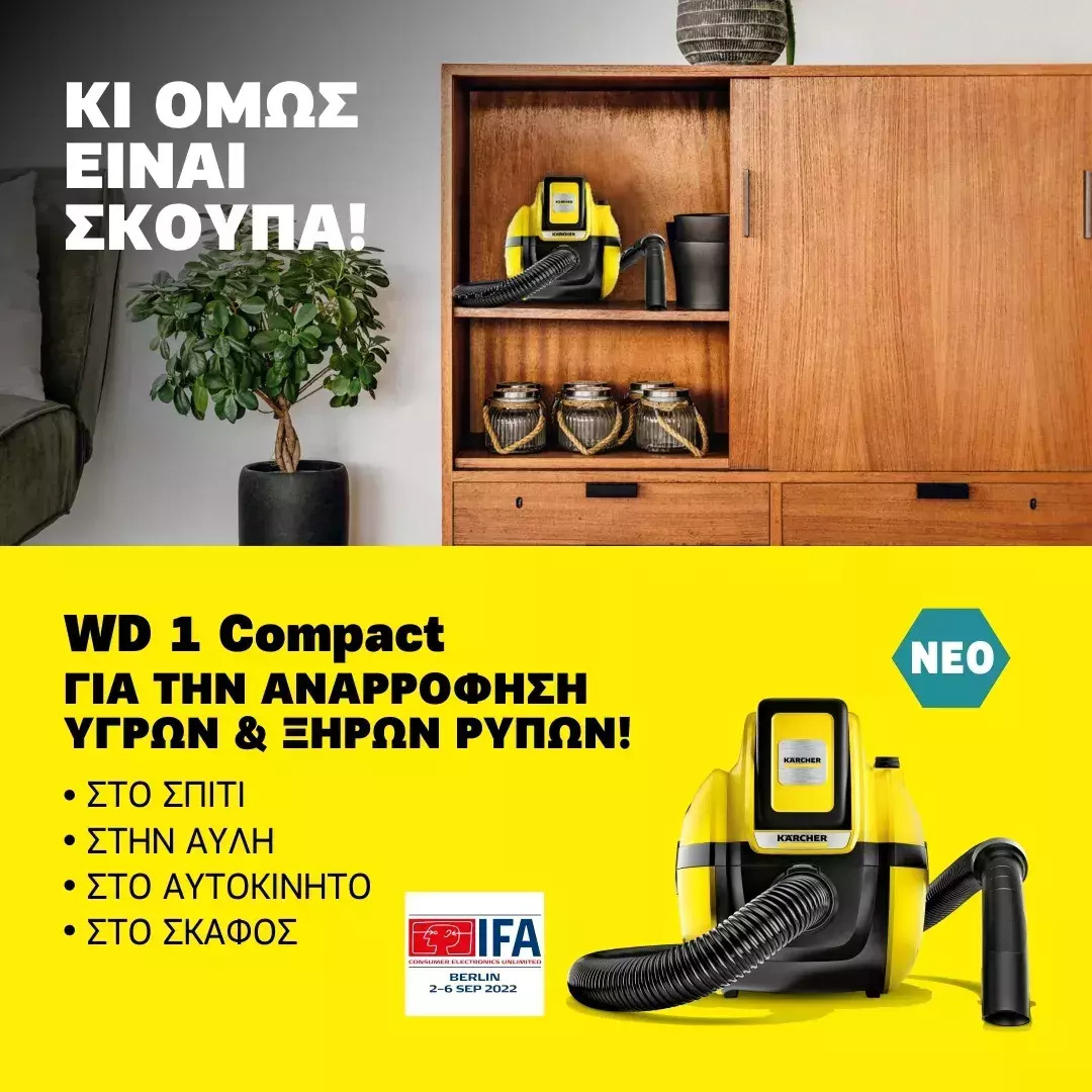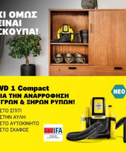 Απεριόριστες δυνατότητες για την μπαταριοκίνητη σκούπα αναρρόφησης πολλαπλών εφαρμογών WD 1 Compact. Για υγρούς και ξηρούς ρύπους. Στη συσκευασία δεν περιλαμβάνεται η μπαταρία. Συμβατότητα με όλες τις μπαταρίες της πλατφόρμας 18 V της Karcher.