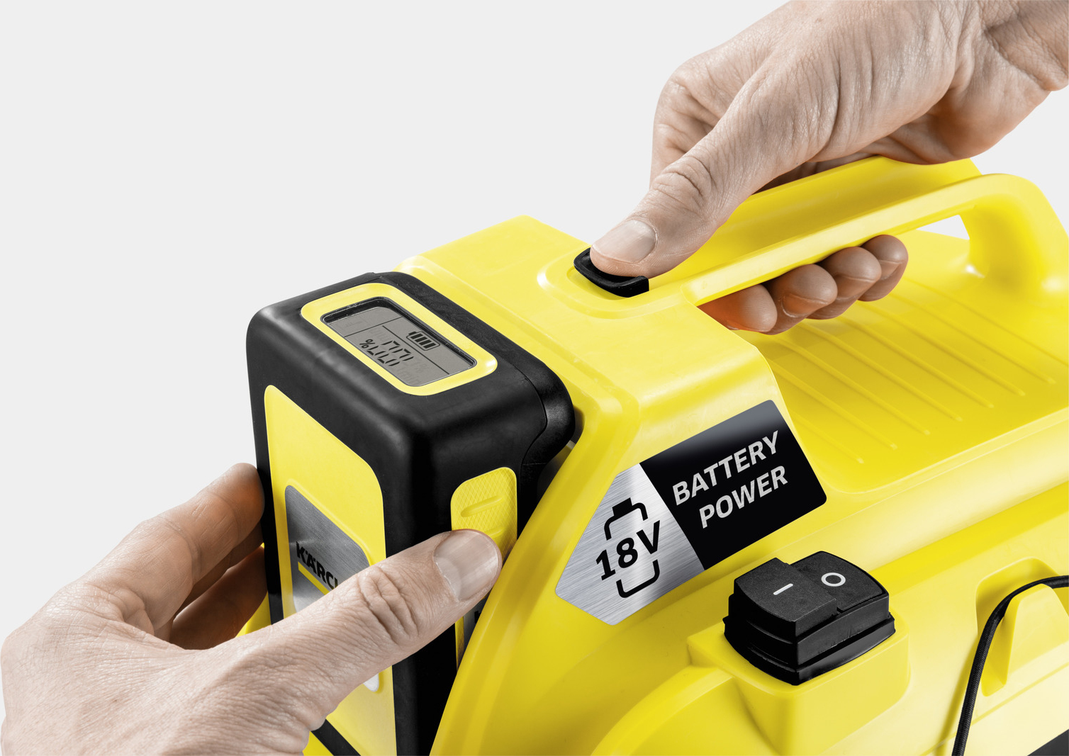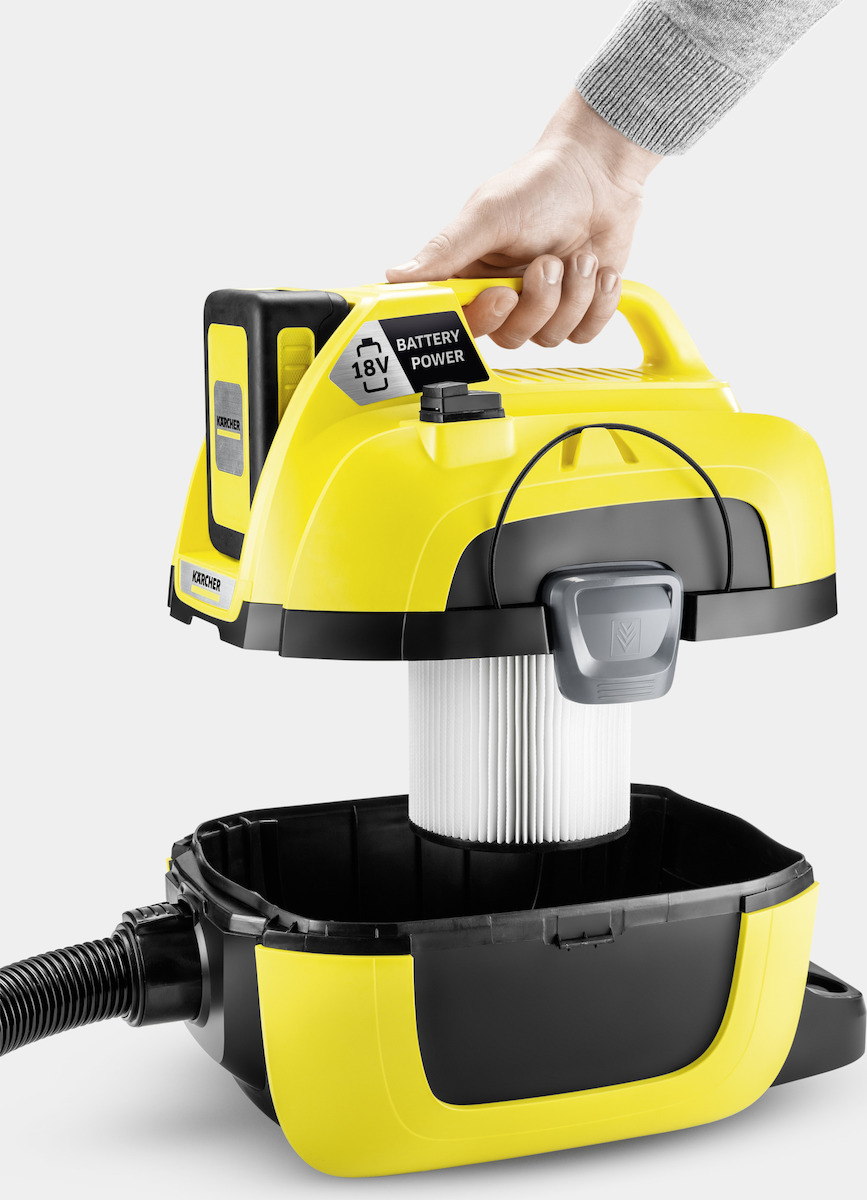Αυτονομία και ευελιξία: η συμπαγής, μπαταριοκίνητη σκούπα αναρρόφησης πολλαπλών εφαρμογών WD 1 Compact Battery Set ανήκει στην πλατφόρμα μπαταριών 18 V Battery Power. Για υγρούς και ξηρούς ρύπους. Η μπαταρία είναι συμβατή με όλες τις συσκευές της πλατφόρμας μπαταριών Karcher 18 V.