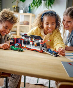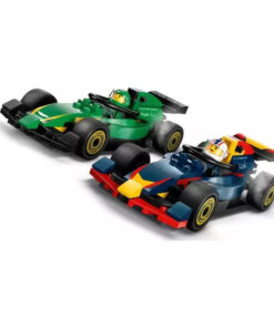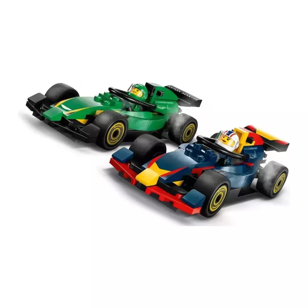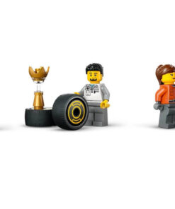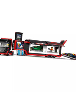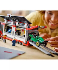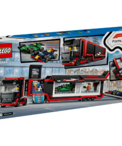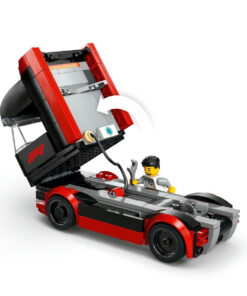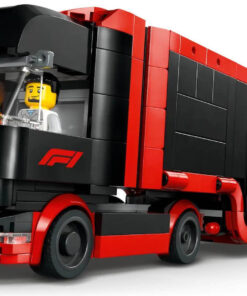 Αυτό το φορτηγό μεταφοράς διαθέτει αποσπώμενο χαμηλωμένο τρέιλερ με δωμάτιο προσομοίωσης F1 και χώρο δύο οχημάτων με πλευρικές επιφάνειες που ανοίγουν πλήρως. Τα παιδιά σηκώνουν την πίσω πόρτα και βγάζουν τις ράμπες φόρτωσης για να ανεβάσουν τα αγωνιστικά αυτοκίνητα RB20 και AMR24 F1.