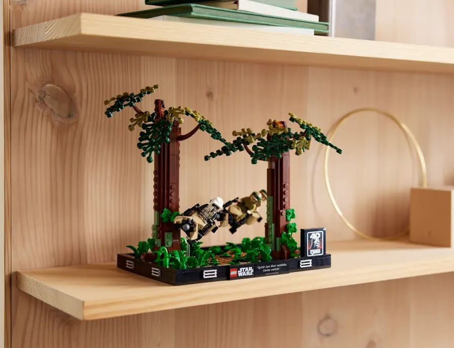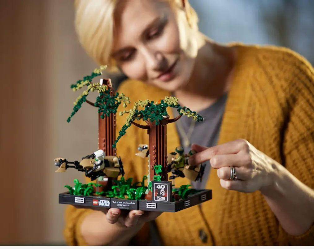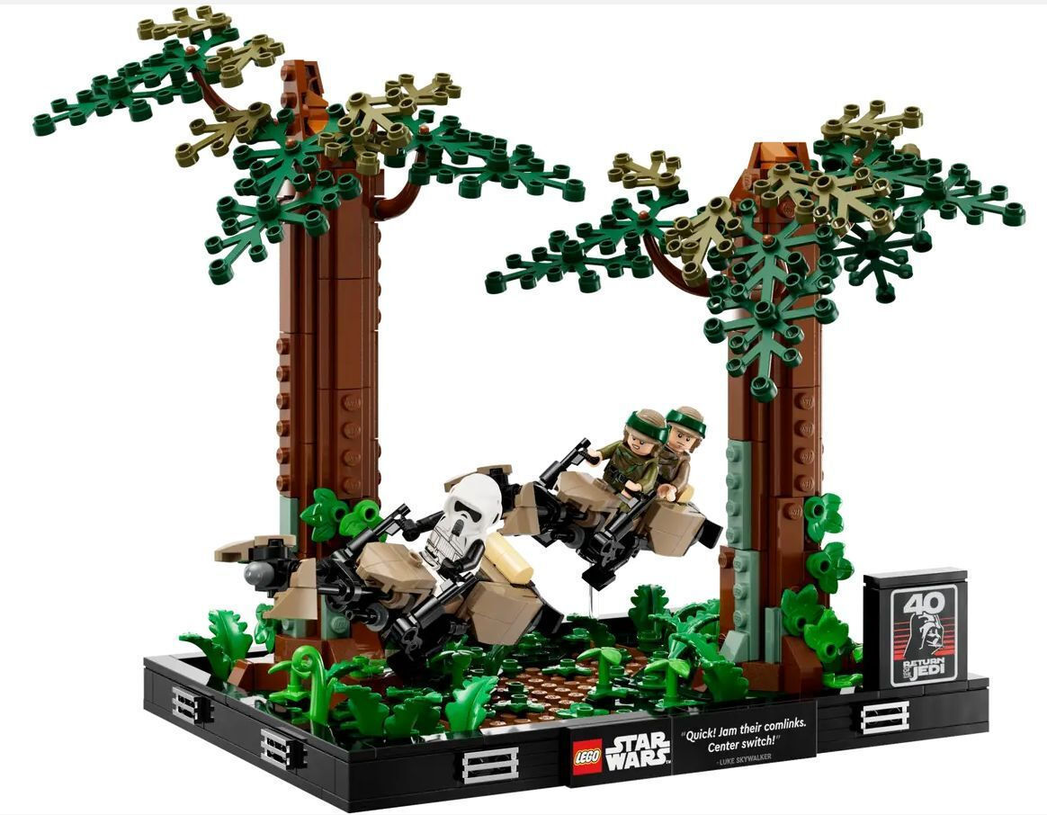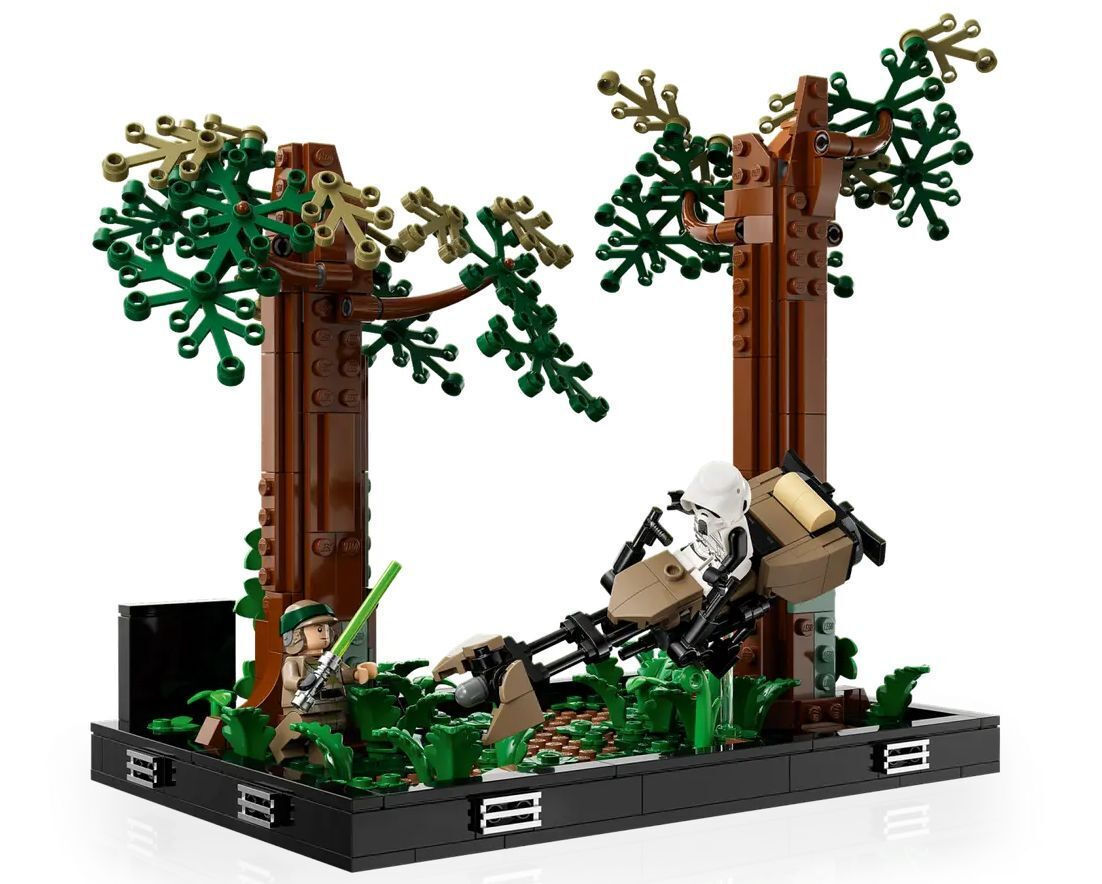 Κατασκευάστε ένα δυναμικό στιγμιότυπο από την καταδίωξη της Πριγκίπισσας Λέια και του Λουκ Σκαϊγουόκερ από έναν Ανιχνευτή στο Δασωμένο Φεγγάρι του Έντορ. Αναπαραστήστε την εμφάνιση του δάσους με κατασκευάσιμα δέντρα και τα νέα στοιχεία φτέρης. Στήστε τα ταχυσκάφη υπό γωνία, σαν να ελίσσονται ανάμεσα στα δέντρα με υψηλή ταχύτητα. Προσθέστε μια πινακίδα για την 40ή επέτειο του Star Wars: Η Επιστροφή των Τζεντάι και ολοκληρώστε ένα νοσταλγικό διακοσμητικό κομμάτι.