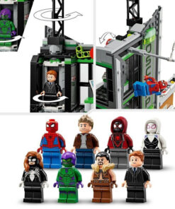 - 8 μίνι φιγούρες LEGO: Spider-Man, Spider-Woman, Miles Morales με μοτοσικλέτα, Eddie Brock, Ghost-Spider, Norman Osborn, Kraven the Hunter και Green Goblin με ανεμόπτερο.