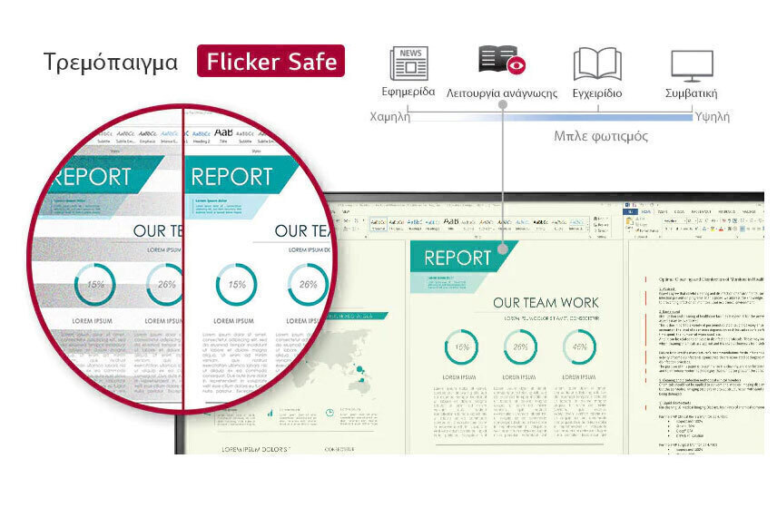 Η λειτουργία Flicker Safe μειώνει το αόρατο τρεμόπαιγμα στην οθόνη και παρέχει ένα πιο άνετο περιβάλλον εργασίας για τα μάτια σου με τη λειτουργία ανάγνωσης, η οποία δημιουργεί μια προβολή με θερμοκρασία χρώματος παρόμοια με αυτήν του χαρτιού.