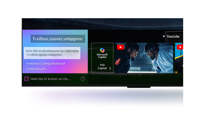 Ζητήστε από την τηλεόρασή σας οτιδήποτε. Το ενσωματωμένο AI αναγνωρίζει τη φωνή σας και παρέχει εξατομικευμένες προτάσεις. Μπορείτε να λάβετε επίσης επιπλέον αποτελέσματα και λύσεις με το Microsoft Copilot.