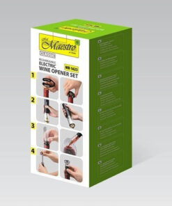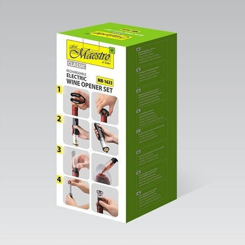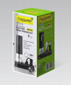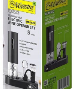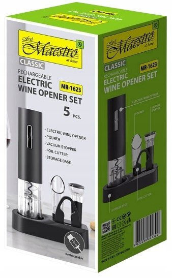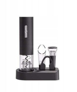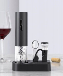 - Σετ αξεσουάρ κρασιού 5 τεμαχίων: Ηλεκτρικό τιρμπουσόν, κόφτης foil, μπουκάλι ρίψης, βαλβίδα κενού, βάση αποθήκευσης