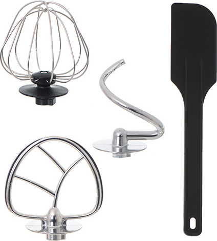 Περιλαμβάνονται ένας γάντζος για το ζύμωμα της ζύμης, ένα σύρμα για την ανάμειξη και ένα σύρμα για το χτύπημα των αυγών, για κάθε ζαχαροπλαστική και μαγειρική σας δημιουργία.
