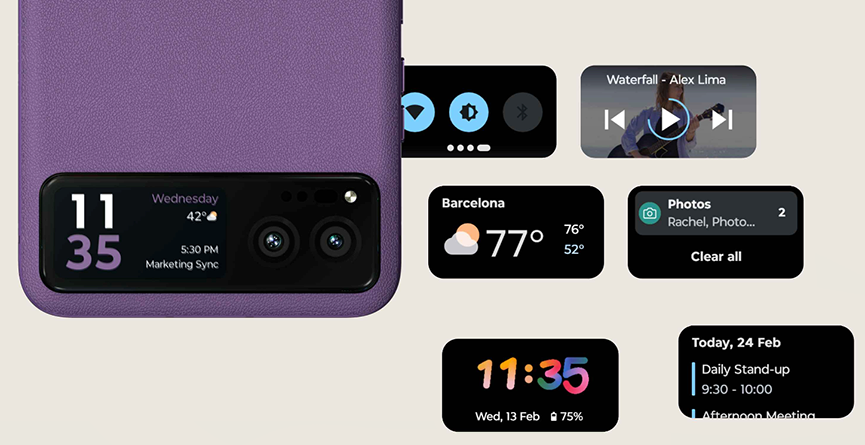 Όταν ξεδιπλώνετε το τηλέφωνο, το Motorola Razr 40 διαθέτει οθόνη LTPO AMOLED 6.9 ιντσών. Η ανάλυση 2640 x 1080 σε συνδυασμό με τον ρυθμό ανανέωσης 144 Hz δημιουργούν μια πραγματικά όμορφη εμπειρία θέασης. Μπορείτε να παίξετε παιχνίδια, να ακούσετε μουσική, να εκτελέσετε πολλές εργασίες ταυτόχρονα και να κάνετε ροή περιεχομένου ομαλά, καθώς το τηλέφωνο τροφοδοτείται με οκταπύρηνο επεξεργαστή Qualcomm SM7450-AB Snapdragon 7 Gen 1 (4 nm).