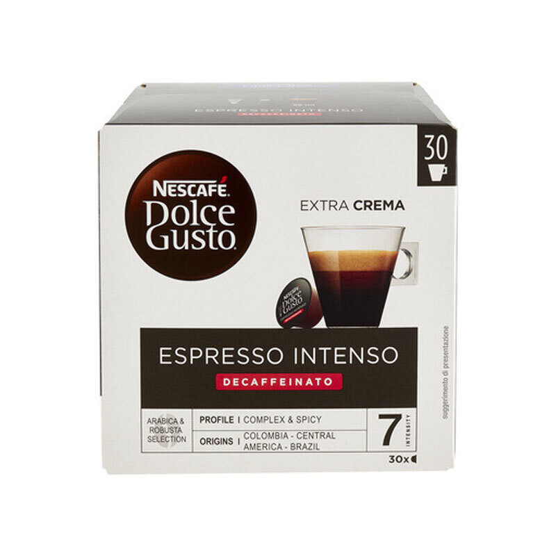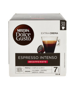 Οι Nescafe Dolce Gusto Espresso Intenso Decaffeinato είναι οι γνήσιες κάψουλες καφέ εσπρέσο του συστήματος Dolce Gusto. Κάθε κάψουλα περιέχει αλεσμένο και καβουρδισμένο καφέ χωρίς καφεΐνη από επιλεγμένες ποικιλίες Arabica. Οι ποικιλίες καφέ προέρχονται από δύο ξεχωριστές περιοχές, την Κολομβία και το Βιετνάμ. Θέλουν να προσφέρουν έναν αρωματικό χαρακτήρα από δημητριακά και κόκκινα εσπεριδοειδή.