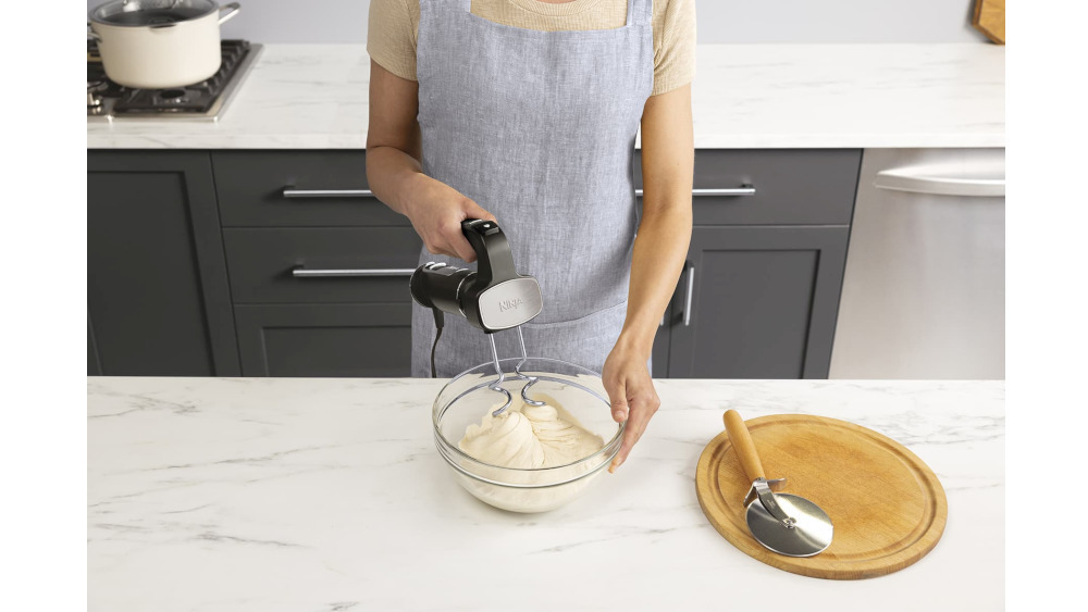 Με το μίξερ χειρός μπορείτε να δημιουργήσετε αφράτα κέικ, τηγανίτες και μπισκότα, σαντιγί, αυγά, σουφλέ και πολλά άλλα σε χρόνο μηδέν. Τα χτυπητήρια έχουν σχεδιαστεί για να ενσωματώνουν γρήγορα αέρα στο μείγμα και να εξασφαλίζουν ένα ελαφρύ, αφράτο αποτέλεσμα ψησίματος. Οι γάντζοι ζύμης μπορούν να χρησιμοποιηθούν για να ζυμώσετε ακόμη και πηχτή ζύμη – τέλεια για ζύμη ψωμιού, πίτσας, ζαχαροπλαστικής ή ζυμαρικών χωρίς ιδιαίτερη προσπάθεια. Η εκκίνηση γίνεται σταδιακά αυξάνοντας αργά την ταχύτητα ανάμειξης για να αποφευχθούν πιτσιλίσματα. Μπορείτε εύκολα να αφαιρέσετε τα εξαρτήματα από τη συσκευή και να τα καθαρίσετε χρησιμοποιώντας το κουμπί εξαγωγής. - Κοπή