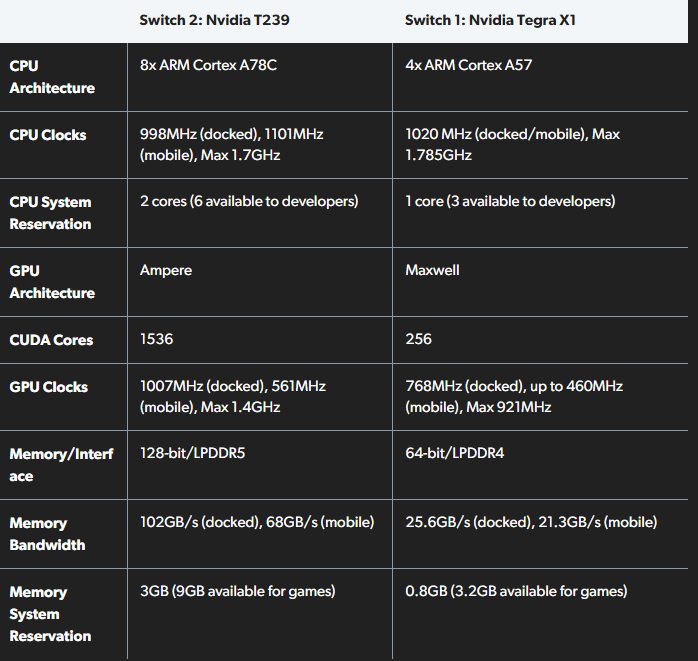 - SoC: Nvidia Tegra T239 με 8 πυρήνες ARM Cortex-A78C.