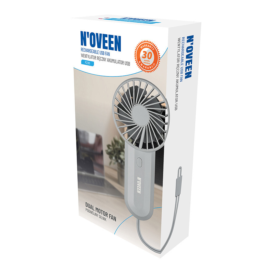 Ο φορητός ανεμιστήρας χειρός F220 είναι επαναφορτιζόμενος μέσω USB και διαθέτει: