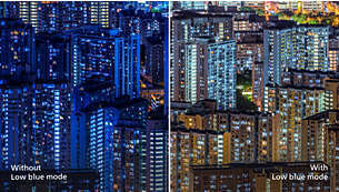 Σύμφωνα με μελέτες, ακριβώς όπως η υπεριώδης ακτινοβολία, έτσι και το μπλε φως μικρού μήκους κύματος που εκπέμπεται από τις οθόνες LED μπορεί να προκαλέσει βλάβες στα μάτια και να επηρεάσει την όραση με την πάροδο του χρόνου. Αναπτυγμένη με γνώμονα την ευεξία, η λειτουργία LowBlue της Philips χρησιμοποιεί μια έξυπνη τεχνολογία λογισμικού για τη μείωση του επιβλαβούς μπλε φωτός μικρού μήκους κύματος.