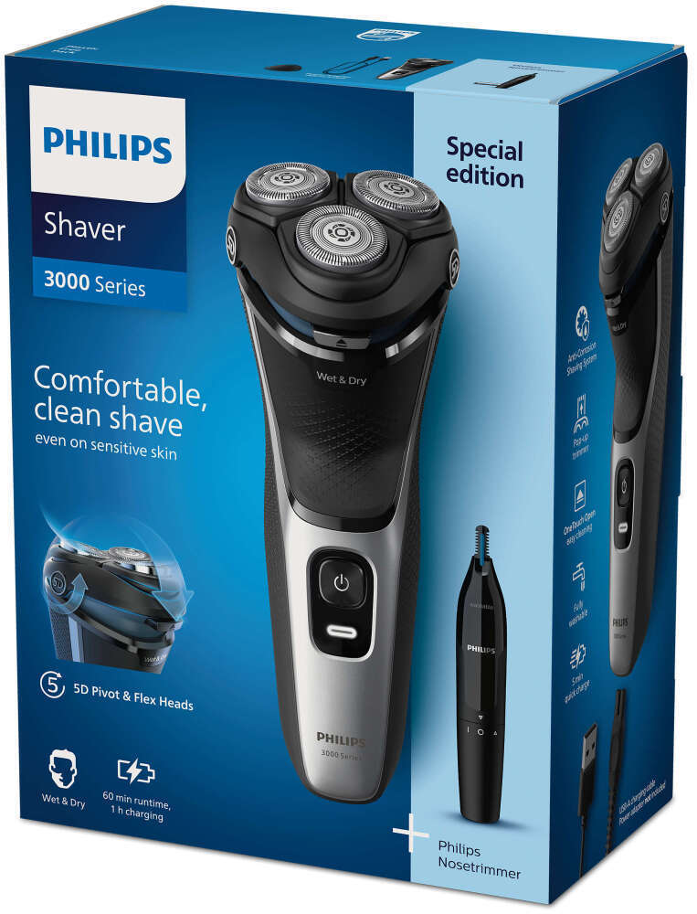 Η ηλεκτρική ξυριστική μηχανή σειράς 3000 της Philips για υγρό και στεγνό ξύρισμα σας προσφέρει άνετο, βαθύ ξύρισμα, ακόμα και σε ευαίσθητο δέρμα. Οι κεφαλές 5D Pivot & Flex, οι 27 αυτοακονιζόμενες λεπίδες PowerCut και η δυνατότητα χρήσης σε υγρό και στεγνό δέρμα εξασφαλίζουν εξαιρετικά, αξιόπιστα αποτελέσματα κάθε φορά.