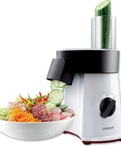 Το Philips SaladMaker μπορεί να κόβει σε φέτες, λωρίδες και ζιλιέν διάφορα λαχανικά, τυριά, αλλαντικά και άλλα υλικά, απευθείας μέσα στη σαλατιέρα ή στα μαγειρικά σκεύη. Με τον πολύ μεγάλο δίσκο ζιλιέν, μπορεί επίσης να κόβει τηγανιτές πατάτες. Ισχυρό μοτέρ 200 W.