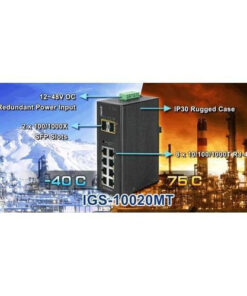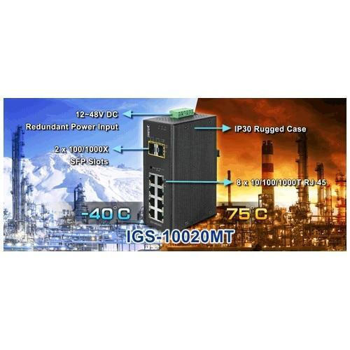 Ο διαχειρίσιμος βιομηχανικός διακόπτης Planet IGS-10020MT διαθέτει 8 θύρες 10/100/1000T και 2 θύρες 100/1000X SFP, σχεδιασμένος για τη δημιουργία γιγαμπιτικών δικτύων κορμού, κατάλληλος για γρήγορη μεταφορά δεδομένων μέσω οπτικών ινών σε απαιτητικά βιομηχανικά περιβάλλοντα. Διαθέτει μεταλλική κατασκευή με πιστοποίηση IP30 και redundant σύστημα τροφοδοσίας.