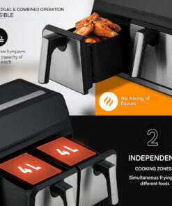 - Διπλοί κάδοι φ frying, καθένας 4 λίτρων, που επιτρέπουν το ταυτόχρονο τηγάνισμα διαφορετικών πιάτων χωρίς καμία ανάμειξη γεύσεων.