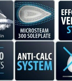 - Πλάκα σιδερώματος Microsteam 300: Για μέγιστη κάλυψη ατμού με πάνω από 300 μικρο-οπές για απαράμιλλη απόδοση και πιο εύκολη διαδικασία σιδερώματος