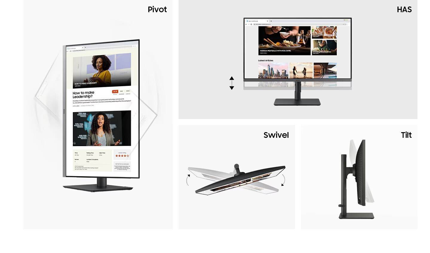 Απόλαυσε τα πλεονεκτήματα μιας οθόνης με ρύθμιση ύψους και κλίσης για την καλύτερη γωνία θέασης και μεγαλύτερη ευελιξία. Τώρα μπορείς επίσης να περιστρέφεις την οθόνη κατά 90 μοίρες — ιδανικό για την προβολή μακροσκελών εγγράφων με λιγότερο κύλισμα.