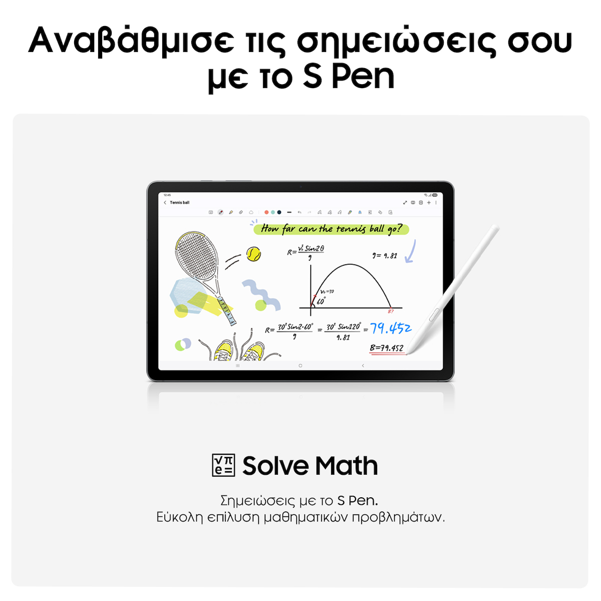 Δυσκολεύεστε με έναν πολύπλοκο μαθηματικό τύπο; Απλώς γράψτε τον με το S Pen και το Solve Math θα υπολογίσει αυτόματα την απάντηση για εσάς. Αυτό το tablet κάνει την επίλυση μαθηματικών προβλημάτων απλή, επιτρέποντάς σας να λύνετε γρήγορα μαθηματικά προβλήματα χωρίς να αλλάζετε εφαρμογές ή να χάνετε την εστίασή σας. Είτε εργάζεστε σε εργασίες είτε εξασκείτε εξισώσεις, σας βοηθά να μαθαίνετε και να προχωράτε.