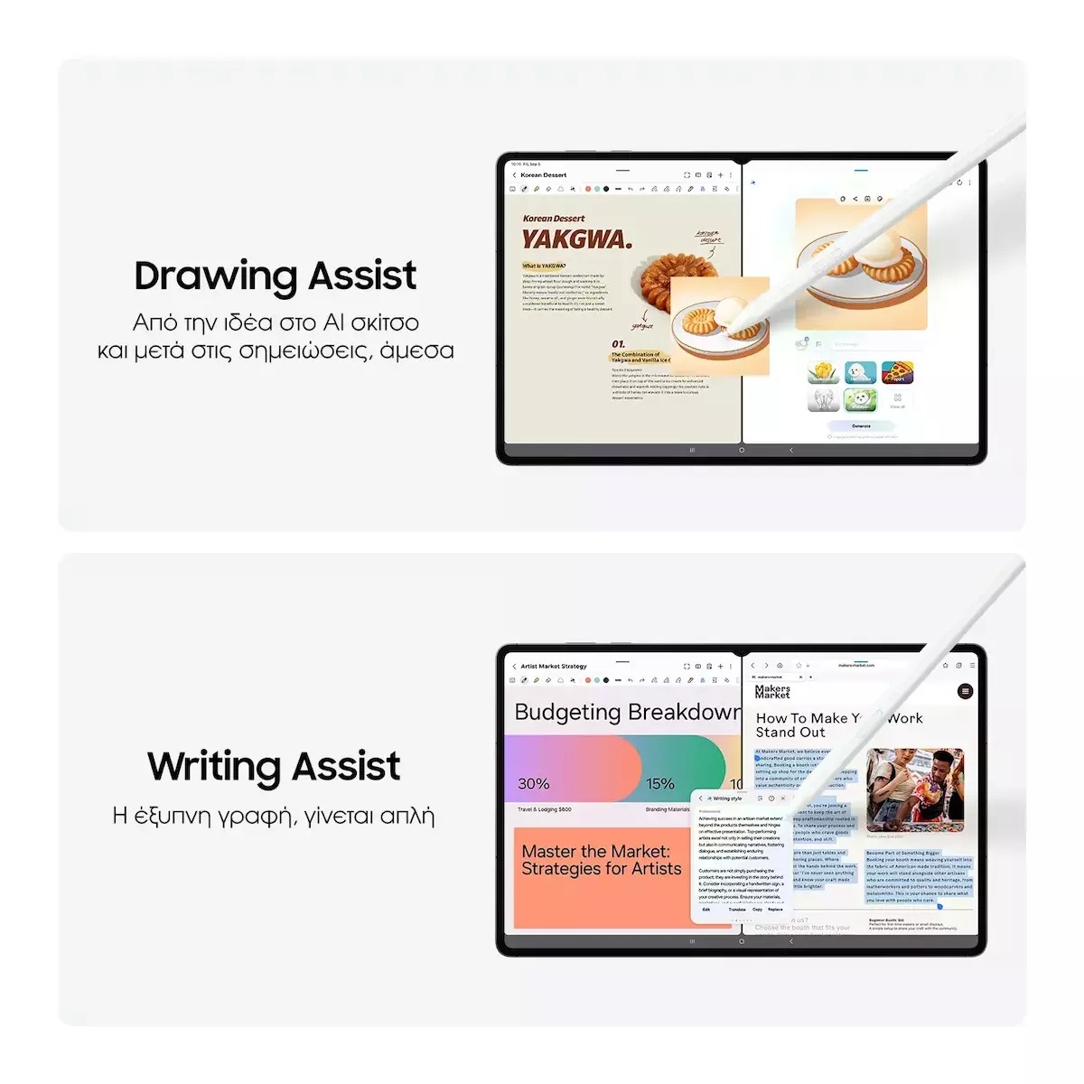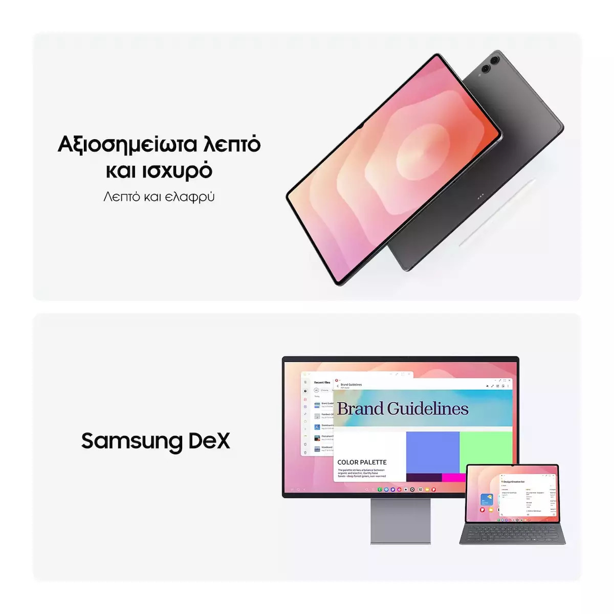 Εξοπλισμένο με ισχυρές AI λειτουργίες σε ένα λεπτό και ελαφρύ σχεδιασμό, το Galaxy Tab S11 Ultra αποτελεί μια πηγή παραγωγικότητας όπου και αν βρίσκεστε. Η εκπληκτική οθόνη του και το S Pen, που δε χρειάζεται φόρτιση, καθιστούν το Galaxy Tab S11 Ultra τον κατάλληλο δημιουργικό σύντροφο όταν τον χρειάζεστε. Και ο ελαφρύς και λεπτός σχεδιασμός του το καθιστά εύκολα φορητό όταν βρίσκεστε εν κινήσει.