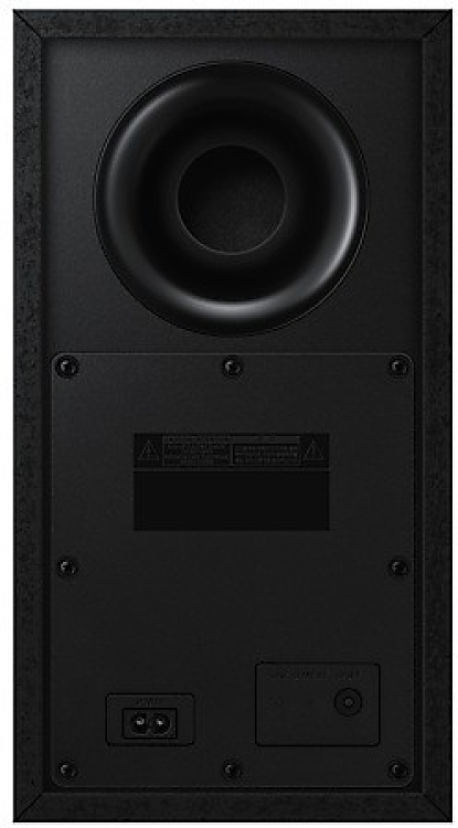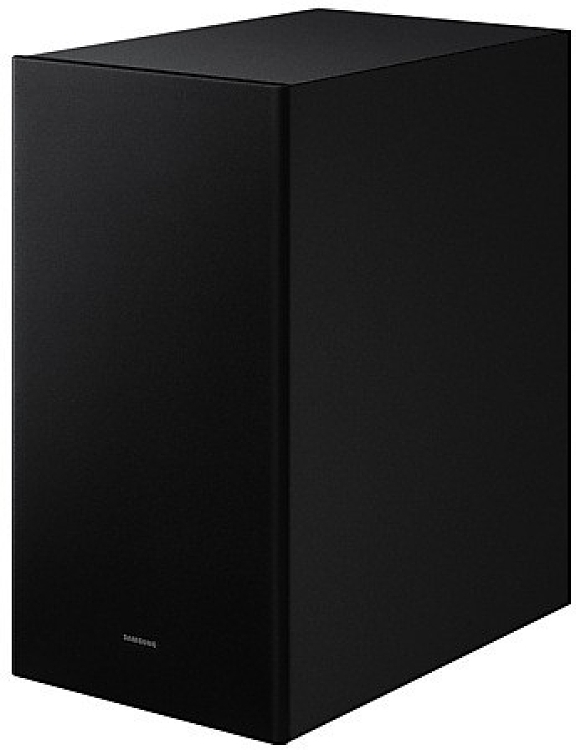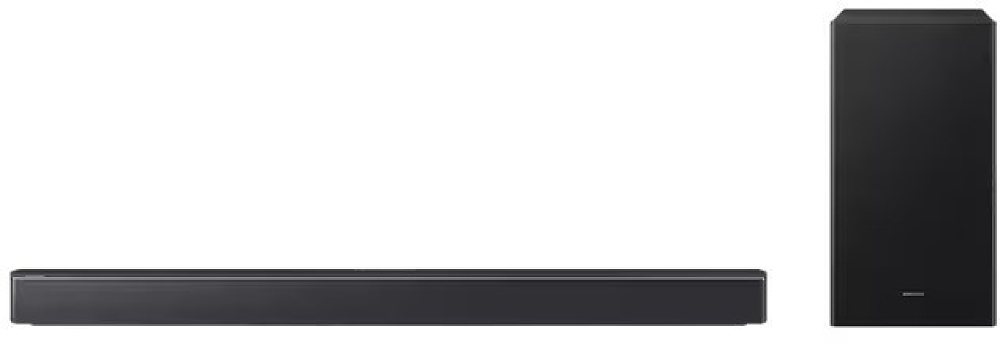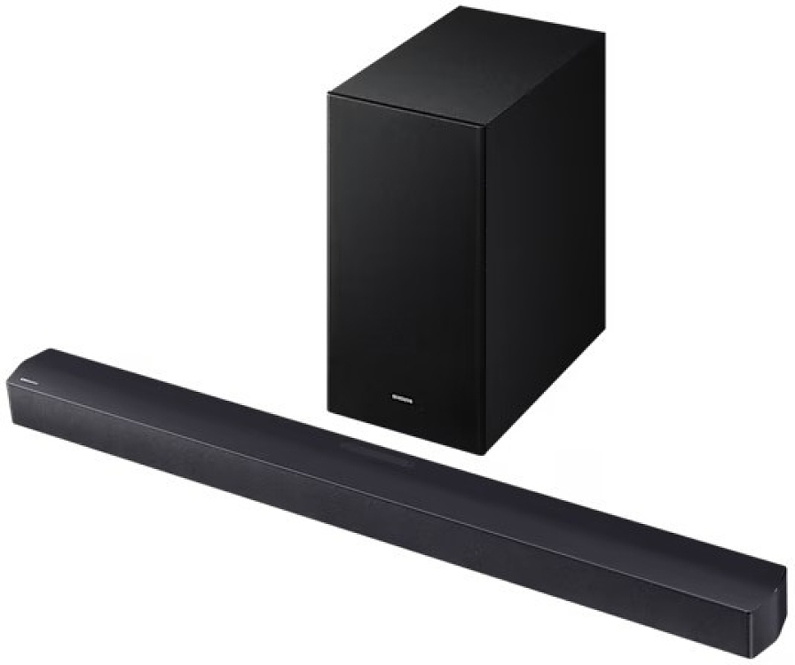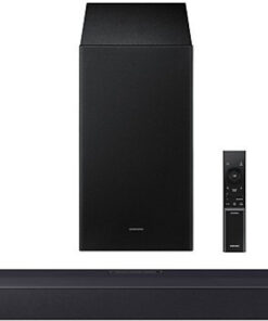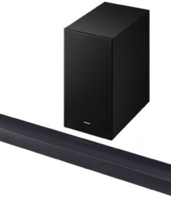 Samsung HW-B450F, ένα soundbar 2.1 καναλιών με συνολική ισχύ 300W, που συνοδεύεται από ασύρματο subwoofer για πλούσια και βαθιά μπάσα, προσφέροντας ολοκληρωμένη ακουστική εμπειρία στο σπίτι.