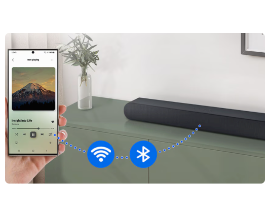 To Samsung Soundbar χρησιμοποιεί Wi-Fi και Bluetooth για εύκολη ασύρματη σύνδεση με άλλες συσκευές. Απολαύστε μουσική από το smartphone σας με υψηλή ποιότητα ήχου, όπου κι αν βρίσκεστε, χωρίς καλώδια.