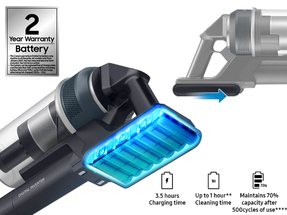 Απολαύστε μεγάλη διάρκεια καθαρισμού χωρίς επαναφόρτιση. Μια μπαταρία υψηλής χωρητικότητας διατηρεί την αναρρόφηση για έως και μία ώρα. Μπορείτε να την αφαιρέσετε και να την αντικαταστήσετε με μια εφεδρική μπαταρία για να καθαρίζετε έως και 2 ώρες. Επίσης διατηρεί το 70% της αρχικής απόδοσης για έως και 500 κύκλους ενώ διαθέτει 2 χρόνια εγγύηση για την μπαταρία.