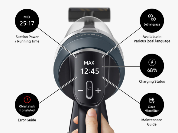 Ελέγξτε και συντηρήστε την ηλεκτρική σας σκούπα άμεσα με την ψηφιακή οθόνη LCD, που υποστηρίζει διάφορες γλώσσες. Με μια ματιά μπορείτε να δείτε το επίπεδο της αναρρόφησης και τον υπολειπόμενο χρόνο της μπαταρίας. Επίσης, σας ειδοποιεί αν υπάρχουν προβλήματα και σας προτείνει λύσεις. Κατά τη φόρτιση, σας δείχνει το ποσοστό φόρτισης.