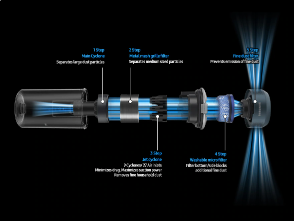 Το σύστημα φιλτραρίσματος πολλαπλών επιπέδων παγιδεύει το 99,999% των σωματιδίων σκόνης και μειώνει τα αλλεργιογόνα. Ο κύριος κυκλώνας και το μεταλλικό πλέγμα φίλτρου αιχμαλωτίζουν τα μεγάλα σωματίδια σκόνης. Το κυκλωνικό σύστημα Jet και το μικροφίλτρο συλλέγουν στη συνέχεια τα μικροσωματίδια της σκόνης και ένα φίλτρο μικροσωματιδίων αιχμαλωτίζει τα μικροσκοπικά σωματίδια σκόνης.