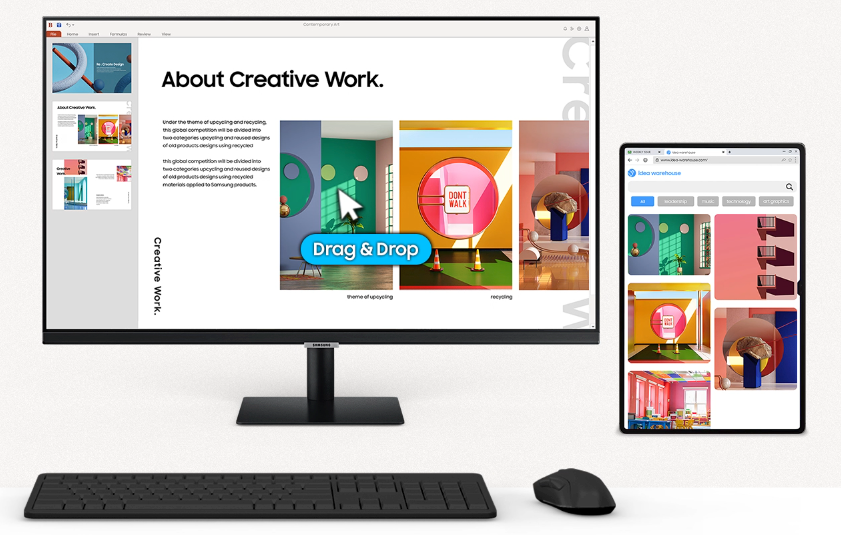 Αξιοποιήστε στο έπακρο τις δυνατότητές σας για multitasking, ελέγχοντας πολλές συμβατές συσκευές με ένα μόνο ποντίκι και πληκτρολόγιο. Απολαύστε εκπληκτική αποδοτικότητα με απρόσκοπτη μεταφορά και απόθεση (drag and drop) περιεχομένου μεταξύ του Smart Monitor, του συμβατού Galaxy Tab και των συμβατών κινητών συσκευών Galaxy