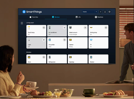 Χάρη στο ενσωματωμένο SmartThings hub στην τηλεόρασή σας, μπορείτε να συνδέετε απρόσκοπτα και να ελέγχετε τις συμβατές με τα πρότυπα Matter και HCA έξυπνες συσκευές σας, χωρίς να χρειάζεστε πρόσθετη συσκευή.
