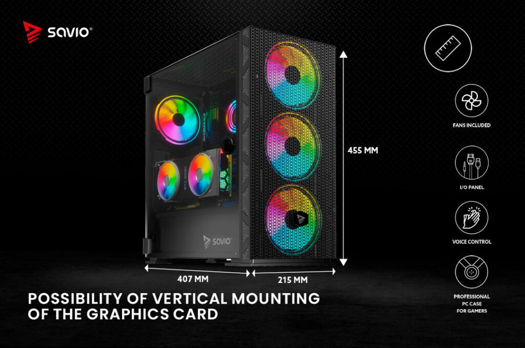 Οι διαστάσεις του περιβλήματος SAVIO Raptor X1 είναι 407 x 215 x 455 mm. Αξιοσημείωτη είναι η μέθοδος τοποθέτησης του πλαϊνού πάνελ, που περιλαμβάνει τους μεντεσέδες και λειτουργεί σαν γυάλινη πόρτα, χάρη στην οποία αποκτάμε μια όμορφη εσωτερική θέαση με πρωτοφανή άνεση χρήσης.