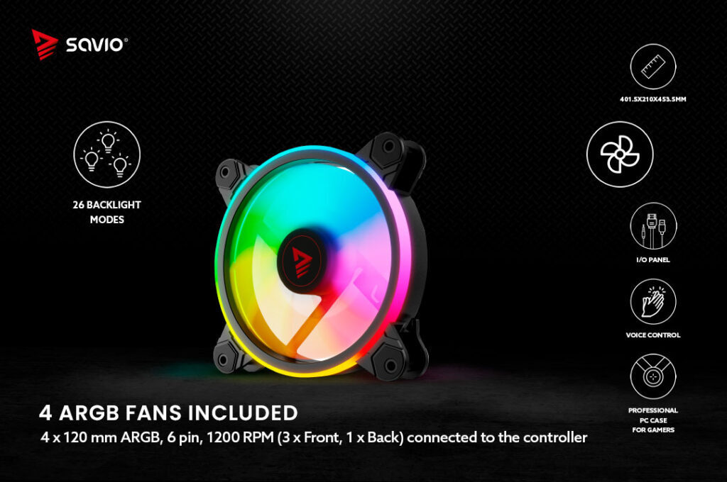 Το SAVIO Raptor X1 είναι εξοπλισμένο με 4 τεμάχια διευθυνσιοδοτούμενων ανεμιστήρων ARGB 6 ακίδων μεγέθους 120 mm και ταχύτητας 1200 σ.α.λ., τα οποία είναι τέλεια ορατά μέσα από δύο γυάλινες πλάκες. Τρεις ανεμιστήρες βρίσκονται ακριβώς πίσω από το γυάλινο μπροστινό πάνελ και ένας στο πίσω μέρος της θήκης. Οι ανεμιστήρες επικοινωνούν χρησιμοποιώντας έναν προηγμένο ελεγκτή οπίσθιου φωτισμού ARGB LED.