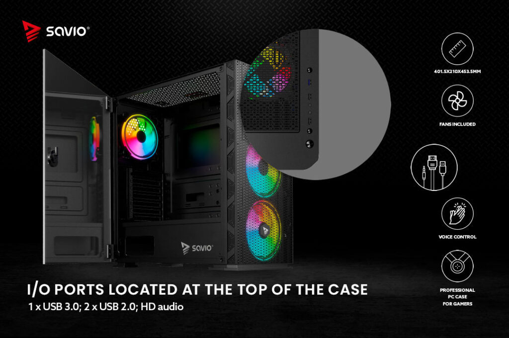 Ο πίνακας I/O στο SAVIO Raptor X1 είναι εξοπλισμένος με τυπικά κουμπιά Power ON και Reset, καθώς και 1 θύρα USB 3.0 και 2 θύρες USB 2.0, εξόδους και εισόδους ήχου HD και ένα πρόσθετο κουμπί RESET / LED για διαχείριση εφέ φωτισμού.