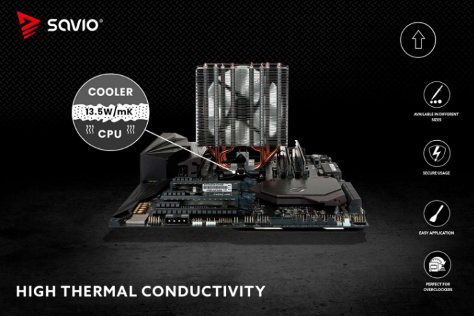 Το SAVIO TG-03 γεμίζει τέλεια τις μικροσκοπικές κοιλότητες στις επιφάνειες του επεξεργαστή και του ψυγείου. Παρέχει τέλειες παραμέτρους αγωγιμότητας. Τα μικροσωματίδια άνθρακα που περιλαμβάνονται στην πάστα καλύπτουν επαρκώς όλες τις κοιλότητες. Οδηγεί σε υψηλή θερμική αγωγιμότητα, εξασφαλίζοντας ότι η θερμότητα απομακρύνεται γρήγορα και αποτελεσματικά.