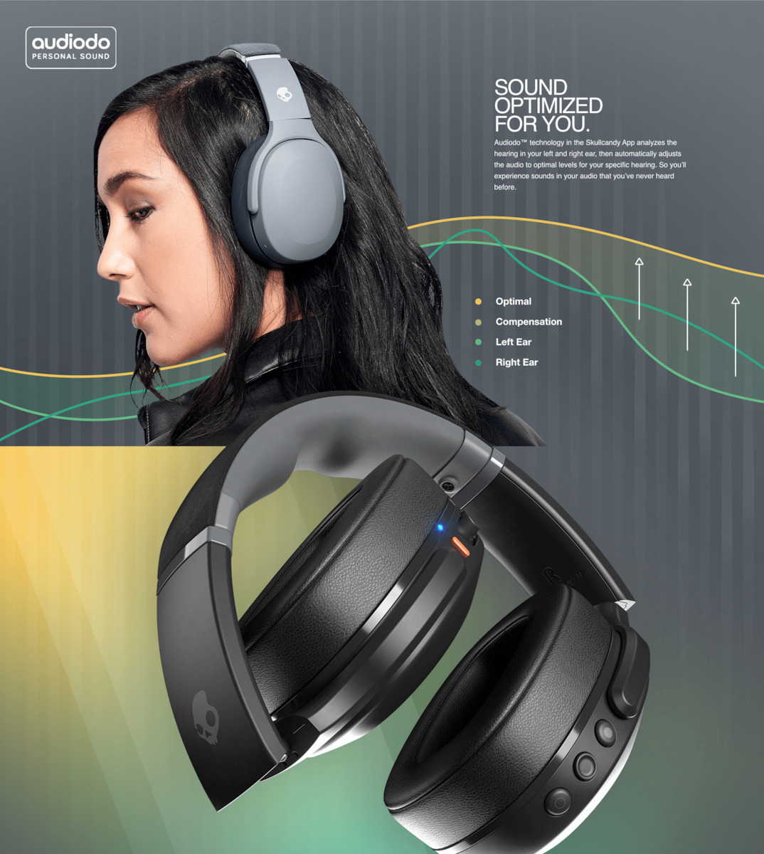 Η τεχνολογία Audiodo™ στην εφαρμογή Skullcandy App αναλύει την ακοή στο αριστερό και το δεξί σας αυτί και στη συνέχεια προσαρμόζει αυτόματα τον ήχο στα βέλτιστα επίπεδα για τη συγκεκριμένη ακοή σας.