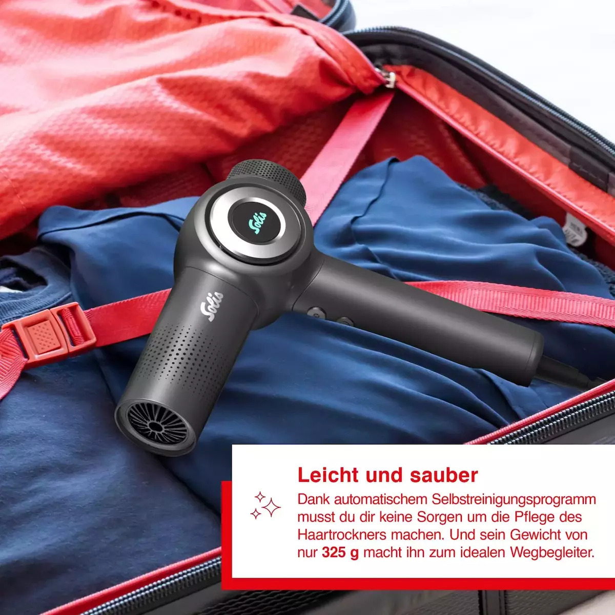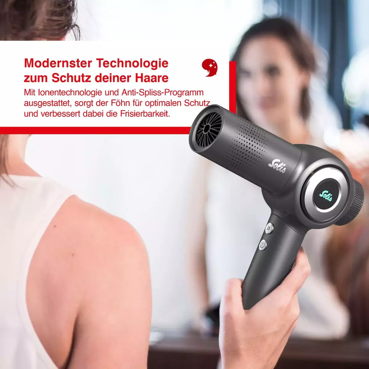 Πιστολάκι μαλλιών της Solis, που διαθέτει ισχύ με ικανοποιητική ροή αέρα για γρήγορο στέγνωμα και φορμάρισμα των μαλλιών.