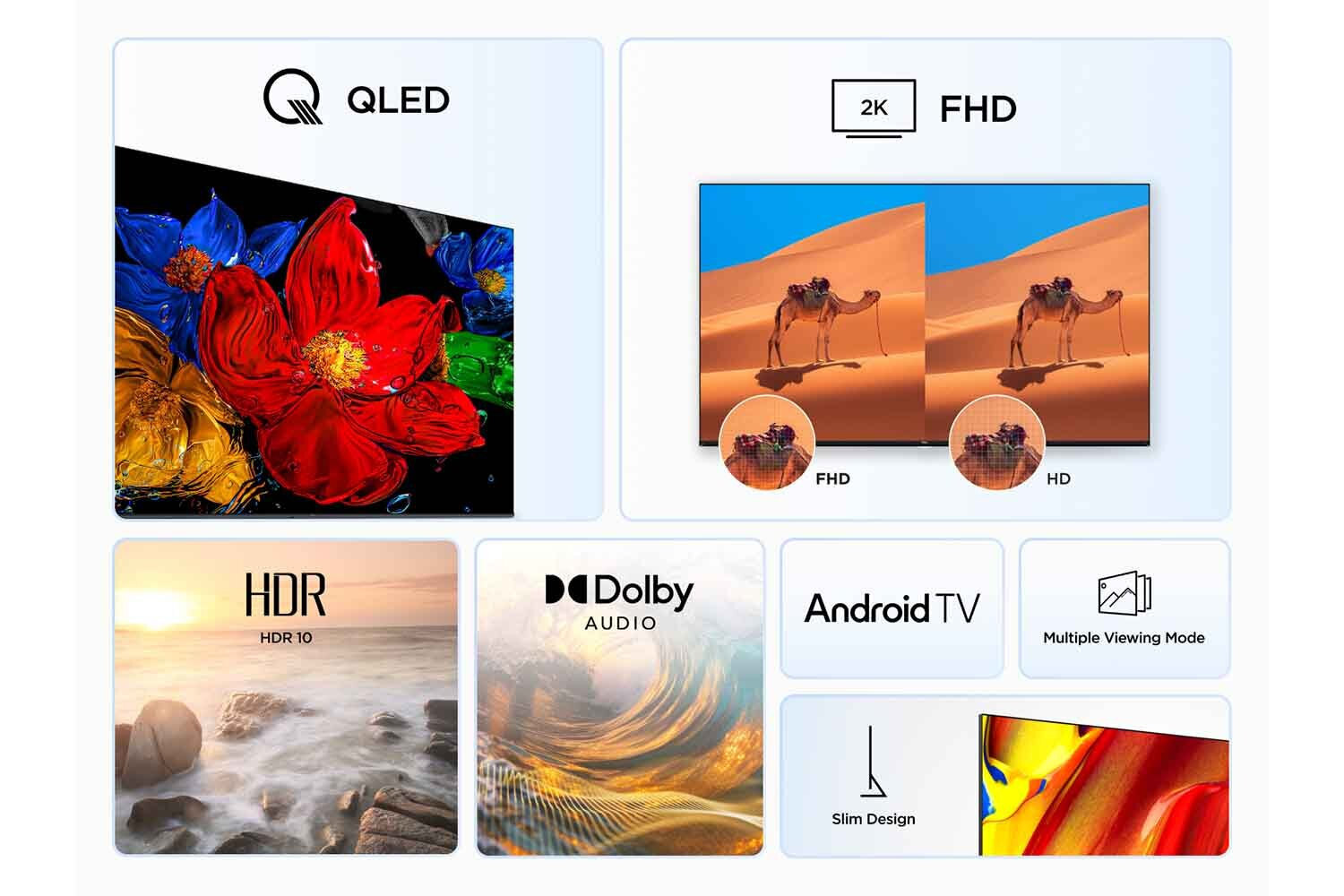 QLED: Η τεχνολογία QLED της TCL χρησιμοποιεί πολύχρωμους κβαντικούς κρυστάλλους, οι οποίοι συνδυάζουν νανοκλίμακας υλικά quantum dot με οργανικά υλικά σε πολλαπλές στρώσεις. Σε συνδυασμό με την τεχνολογία οπίσθιου φωτισμού, αυτή η καινοτομία προσφέρει εξαιρετικά χρώματα και οπτικές ιδιότητες. Η ενισχυμένη φωτεινότητα αναδεικνύει ακόμη και τις πιο λεπτές λεπτομέρειες, προσφέροντας μια πραγματικά καθηλωτική και ρεαλιστική εμπειρία θέασης.