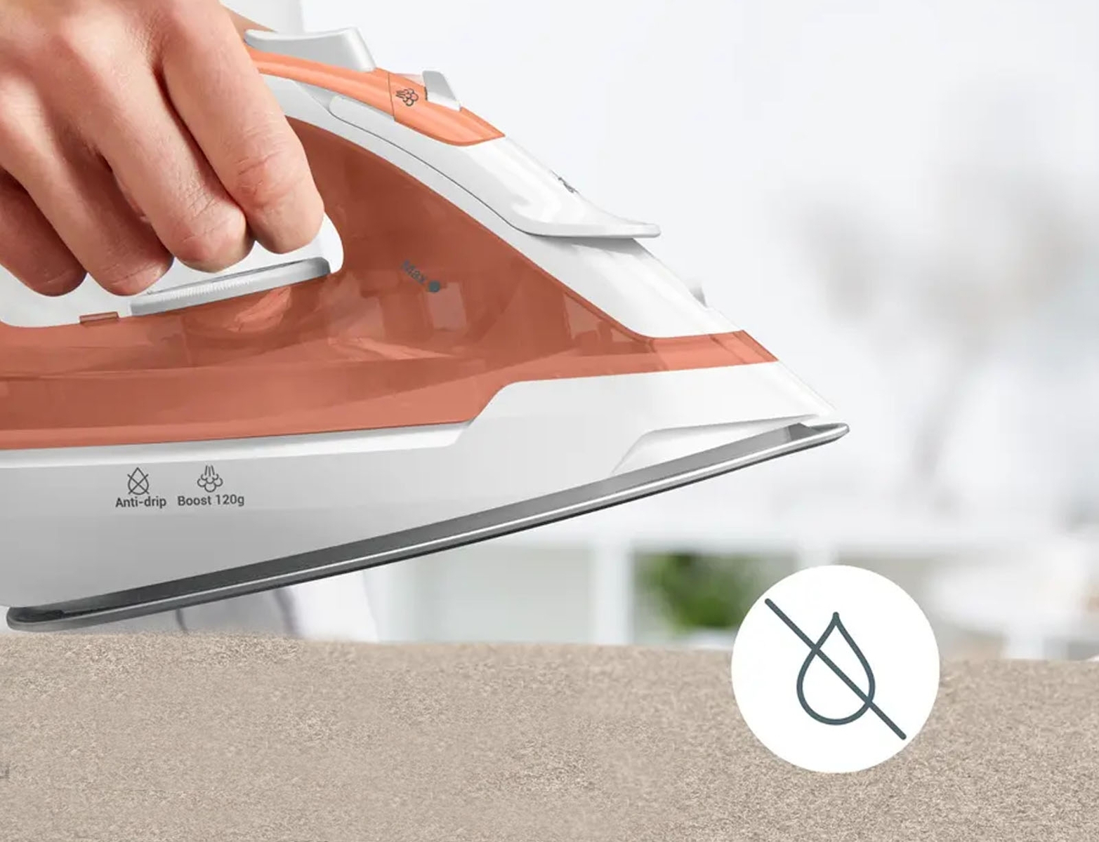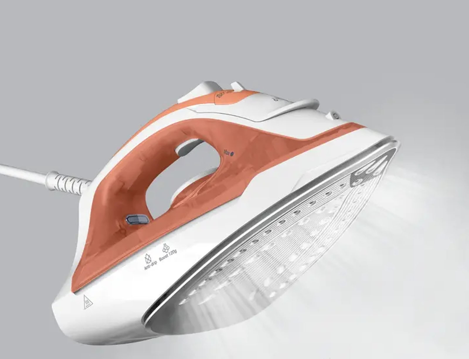 - Δυνατή ώθηση ατμού: Ικανότητα ώθησης ατμού έως 120 g/min για την επίπεδη εξομάλυνση ακόμη και των πιο δύσκολων ρυτίδων σε χονδρά υφάσματα.