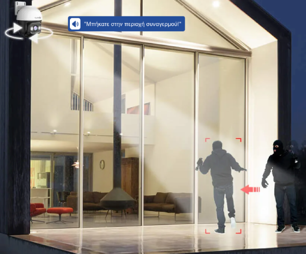 Όταν οι άνθρωποι εισέρχονται στην προστατευμένη περιοχή, η κάμερα θα παρακολουθεί αυτόματα και θα δίνει ηχητική προειδοποίηση με το σποτ που αναβοσβήνει (τρεις ηχητικούς συναγερμούς μπορούν να προσαρμοστούν), αφού ολοκληρωθεί η παρακολούθηση, η κάμερα θα επιστρέψει στη θέση που πρέπει να φυλάξετε.