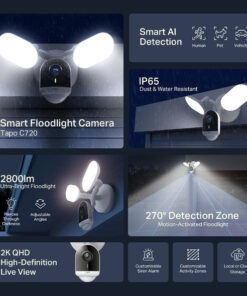 Ο ισχυρός, πλήρως ρυθμιζόμενος προβολέας και η έγχρωμη νυχτερινή όραση του Tapo C720 βλέπει έως και 30 πόδια μακριά, ώστε να μπορείτε να κοιμάστε ήσυχοι γνωρίζοντας ότι το περιβάλλον σας είναι ασφαλές.