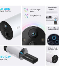 Ψηφιακή IP κάμερα ασφαλείας της εταιρείας TP-LINK, με Full HD+ ανάλυση εικόνας στα 4MP. Για την μετάδοση της εικόνας, συνδέεται απευθείας σε ένα δίκτυο IP, όπως το Internet ή ένα τοπικό δίκτυο (LAN), επιτρέποντας τον απομακρυσμένο έλεγχο του χώρου εγκατάστασης, μέσω υπολογιστή ή άλλης συσκευής (smartphone ή tablet), που έχει πρόσβαση στο ίδιο δίκτυο.