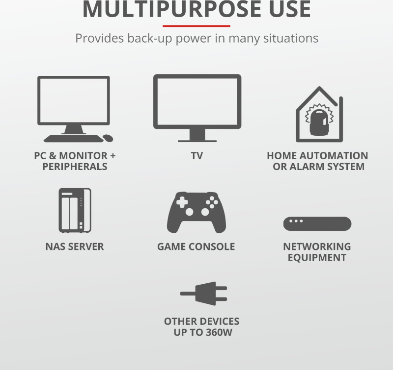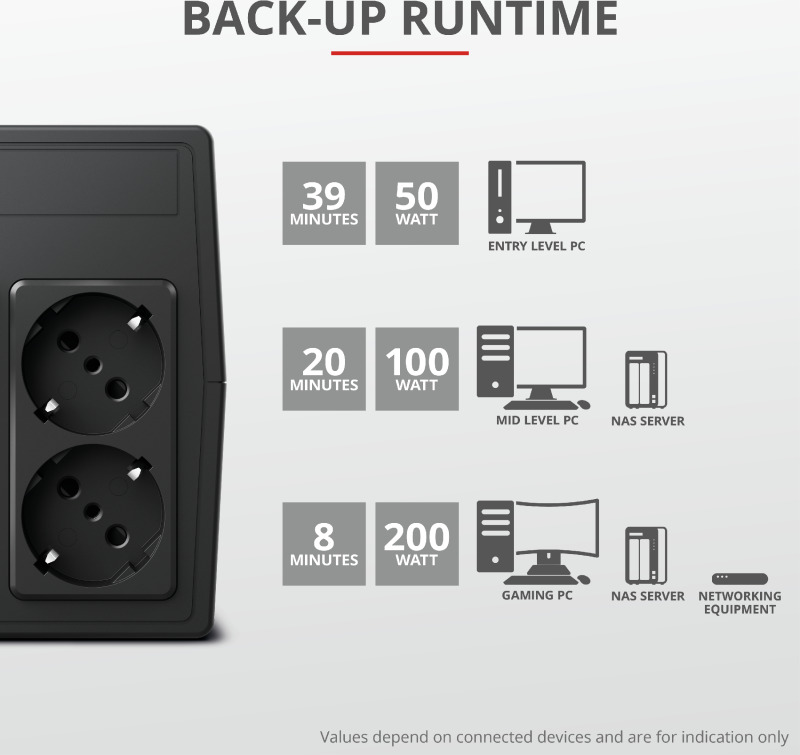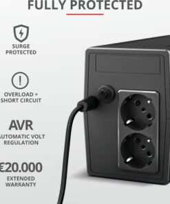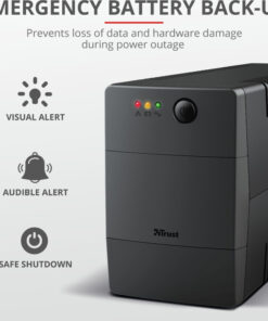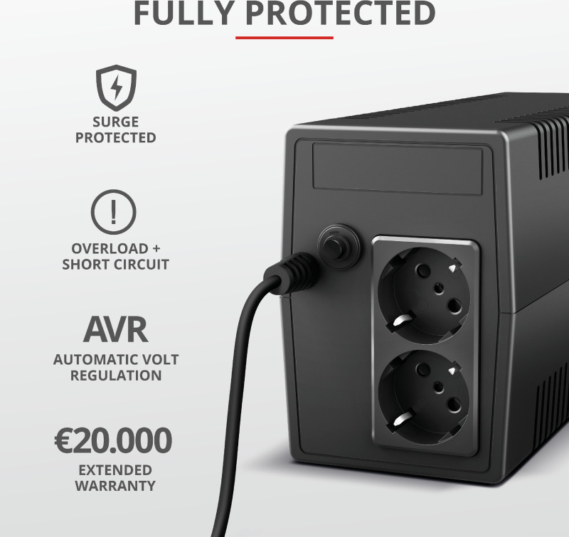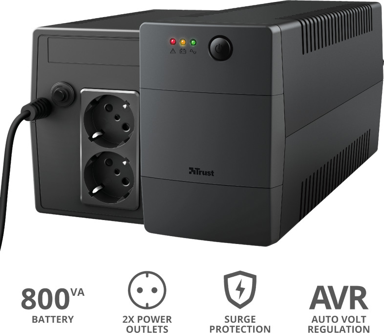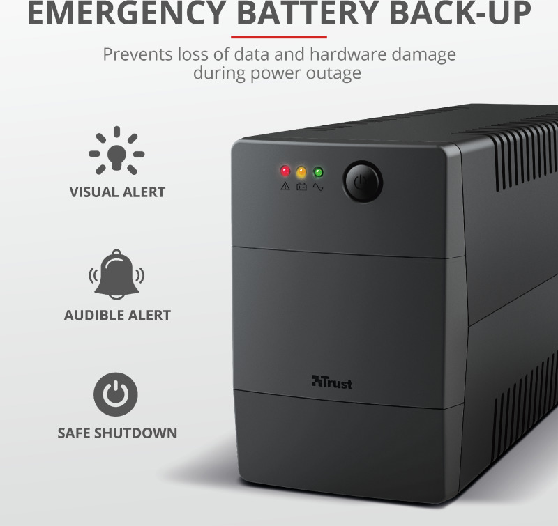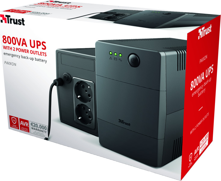 Σε ασφαλή χέρια. Η Trust Paxxon 800VA φροντίζει τις συσκευές σας. Ένα αξιόπιστο UPS είναι η ιδανική δευτερεύουσα πηγή τροφοδοσίας για ηλεκτρονικά, διατηρώντας τα προσωρινά κατά τη διάρκεια διακοπών ρεύματος και προστατεύοντάς τα από ζημιές που προκαλούνται από υπερτάσεις ρεύματος.