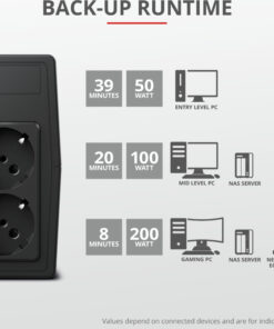 Χάρη στη λειτουργία AVR, το UPS διατηρεί σταθερή τάση εξόδου. Σε περίπτωση υπερτάσεων ή υπερτάσεων ρεύματος, ο εξοπλισμός σας είναι σε ασφαλή χέρια. Προσφέρεται εκτεταμένη εγγύηση έως και 20.000 ευρώ για συνδεδεμένο εξοπλισμό.